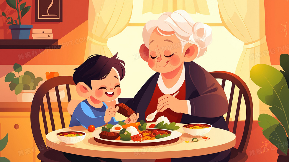 本作品内容为小男孩陪伴奶奶吃饭插画, 格式为 jpg, 大小2 MB, 图片尺寸为2912 x 1632, 源文件无水印, 欢迎使用熊猫办公。 如认为平台内容涉嫌侵权,可通过邮件:tousu@tukuppt.com提出书面通知,我们将及时处理。