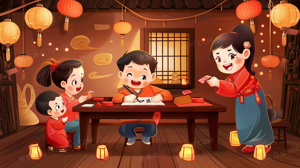 本作品内容为春节一家人在家写对联插画, 格式为 jpg, 大小3 MB, 图片尺寸为2912 x 1632, 源文件无水印, 欢迎使用熊猫办公。 如认为平台内容涉嫌侵权,可通过邮件:tousu@tukuppt.com提出书面通知,我们将及时处理。