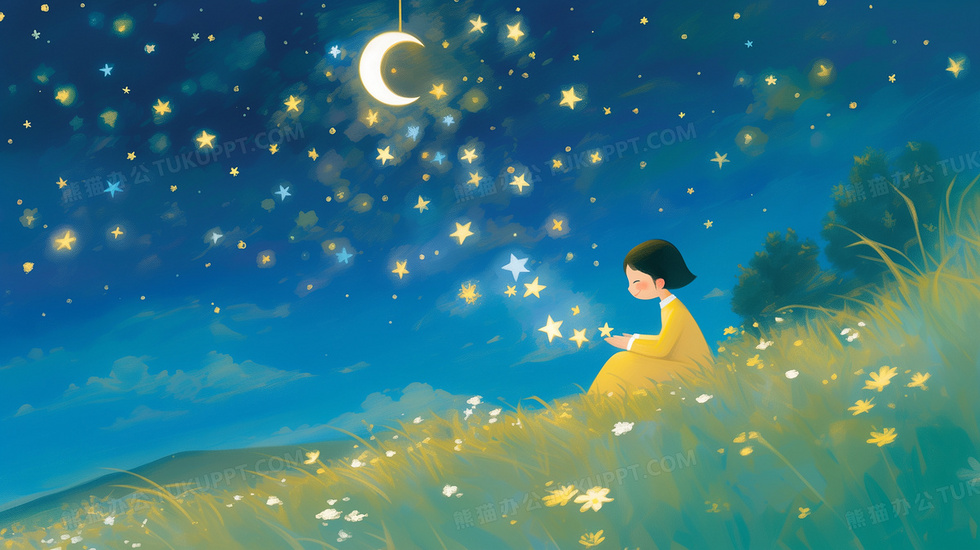 本作品内容为穿黄色裙子的女孩在草地上捡星星插画, 格式为 jpg, 大小7 MB, 图片尺寸为2912 x 1632, 源文件无水印, 欢迎使用熊猫办公。 如认为平台内容涉嫌侵权,可通过邮件:tousu@tukuppt.com提出书面通知,我们将及时处理。