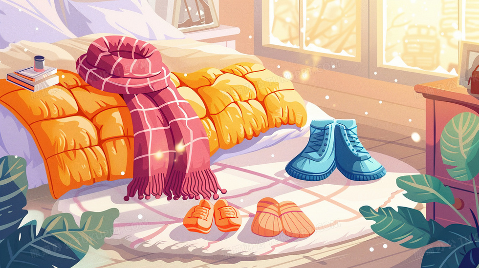本作品内容为冬天床上厚被子厚衣服围巾保暖用品插画, 格式为 jpg, 大小4 MB, 图片尺寸为2912 x 1632, 源文件无水印, 欢迎使用熊猫办公。 如认为平台内容涉嫌侵权,可通过邮件:tousu@tukuppt.com提出书面通知,我们将及时处理。