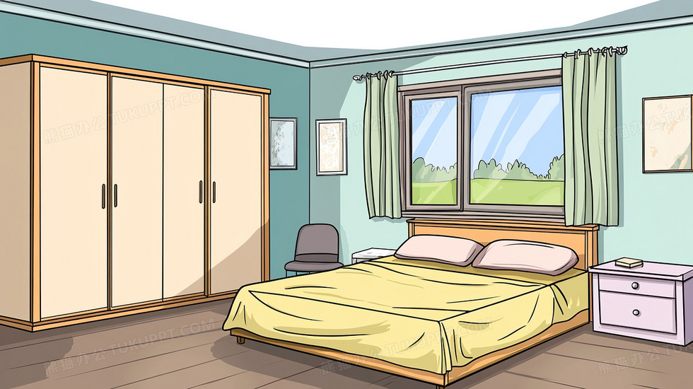本作品内容为手绘风卧室场景插画, 格式为 jpg, 大小2 MB, 图片尺寸为2912 x 1632, 源文件无水印, 欢迎使用熊猫办公。 如认为平台内容涉嫌侵权,可通过邮件:tousu@tukuppt.com提出书面通知,我们将及时处理。