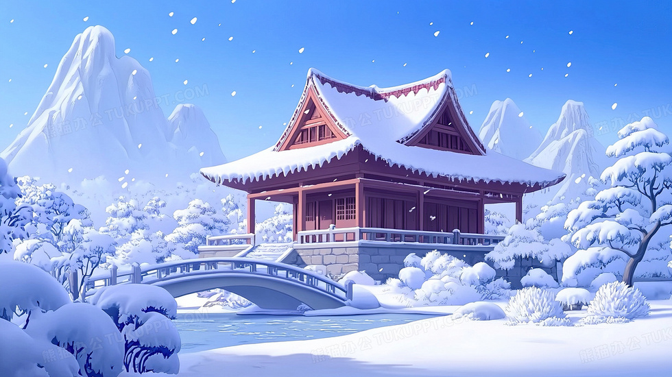 本作品内容为冬季古建筑桥梁雪景插画, 格式为 jpg, 大小3 MB, 图片尺寸为2912 x 1632, 源文件无水印, 欢迎使用熊猫办公。 如认为平台内容涉嫌侵权,可通过邮件:tousu@tukuppt.com提出书面通知,我们将及时处理。