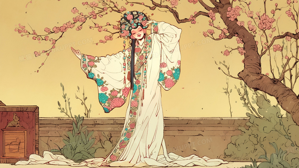 本作品内容为桃花树下表演的京剧人物插画, 格式为 jpg, 大小4 MB, 图片尺寸为2912 x 1632, 源文件无水印, 欢迎使用熊猫办公。 如认为平台内容涉嫌侵权,可通过邮件:tousu@tukuppt.com提出书面通知,我们将及时处理。