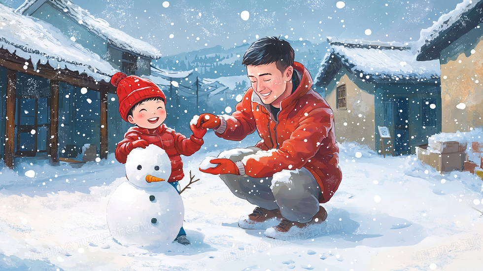 首页 > 插画 > 科技艺术 > 水彩手绘 > 寒冷冬天堆雪人的爸爸和小男孩插画
