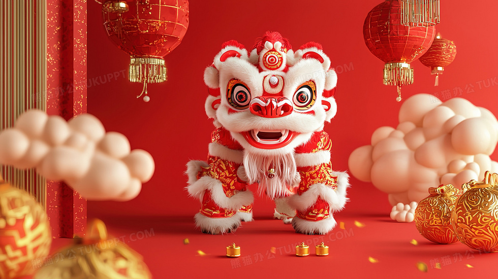 本作品内容为3D春节舞台表演舞狮子灯笼插画, 格式为 jpg, 大小3 MB, 图片尺寸为2912 x 1632, 源文件无水印, 欢迎使用熊猫办公。 如认为平台内容涉嫌侵权,可通过邮件:tousu@tukuppt.com提出书面通知,我们将及时处理。