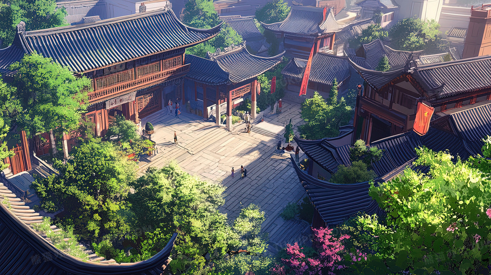 本作品内容为俯视中式建筑庭院风景插画, 格式为 jpg, 大小5 MB, 图片尺寸为2912 x 1632, 源文件无水印, 欢迎使用熊猫办公。 如认为平台内容涉嫌侵权,可通过邮件:tousu@tukuppt.com提出书面通知,我们将及时处理。