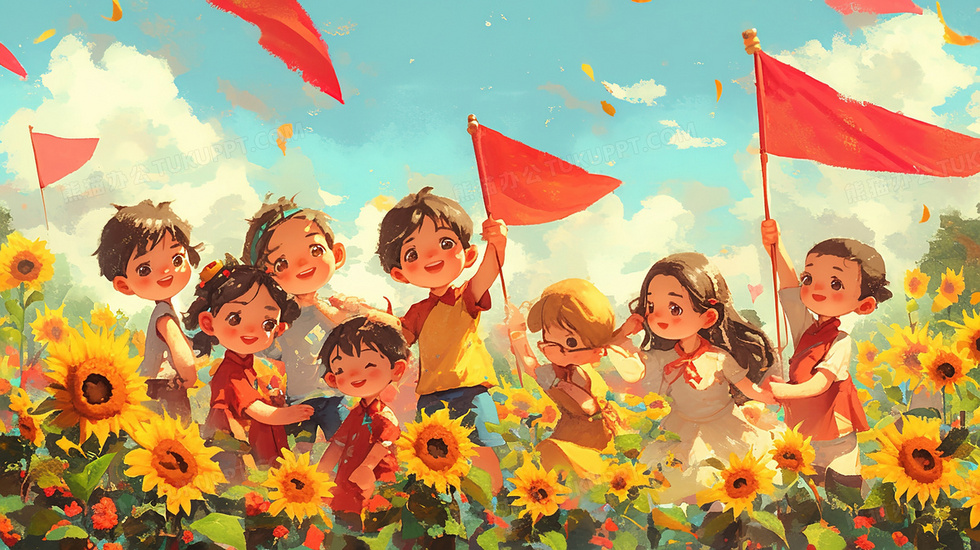 首页 > 插画 > 科技艺术 > 水彩手绘 > 国庆向日葵花海手拿红旗的小学生插画