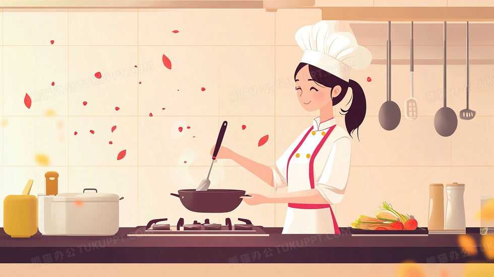 本作品内容为女厨师厨房做饭炒菜插画, 格式为 jpg, 大小2 MB, 图片尺寸为2912 x 1632, 源文件无水印, 欢迎使用熊猫办公。 如认为平台内容涉嫌侵权,可通过邮件:tousu@tukuppt.com提出书面通知,我们将及时处理。