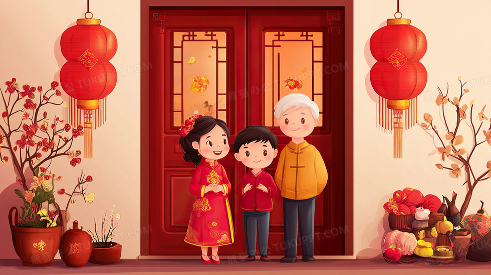 本作品内容为喜庆春节过年拜年走亲戚插画, 格式为 jpg, 大小3 MB, 图片尺寸为2912 x 1632, 源文件无水印, 欢迎使用熊猫办公。 如认为平台内容涉嫌侵权,可通过邮件:tousu@tukuppt.com提出书面通知,我们将及时处理。