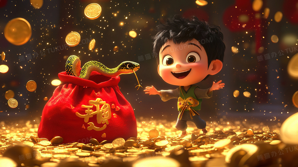 本作品内容为手拿装满金币福袋卡通男孩与蛇插画, 格式为 jpg, 大小3 MB, 图片尺寸为2912 x 1632, 源文件无水印, 欢迎使用熊猫办公。 如认为平台内容涉嫌侵权,可通过邮件:tousu@tukuppt.com提出书面通知,我们将及时处理。