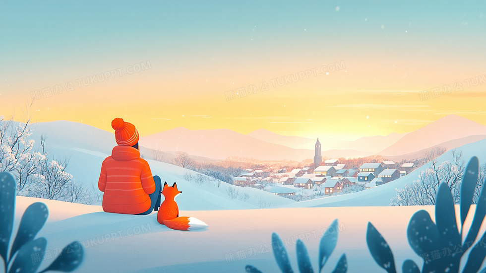本作品内容为冬天雪地山上看日出的人物背影插画, 格式为 jpg, 大小3 MB, 图片尺寸为2912 x 1632, 源文件无水印, 欢迎使用熊猫办公。 如认为平台内容涉嫌侵权,可通过邮件:tousu@tukuppt.com提出书面通知,我们将及时处理。