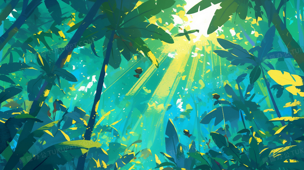本作品内容为热带雨林中照射的太阳光插画, 格式为 jpg, 大小6 MB, 图片尺寸为2912 x 1632, 源文件无水印, 欢迎使用熊猫办公。 如认为平台内容涉嫌侵权,可通过邮件:tousu@tukuppt.com提出书面通知,我们将及时处理。