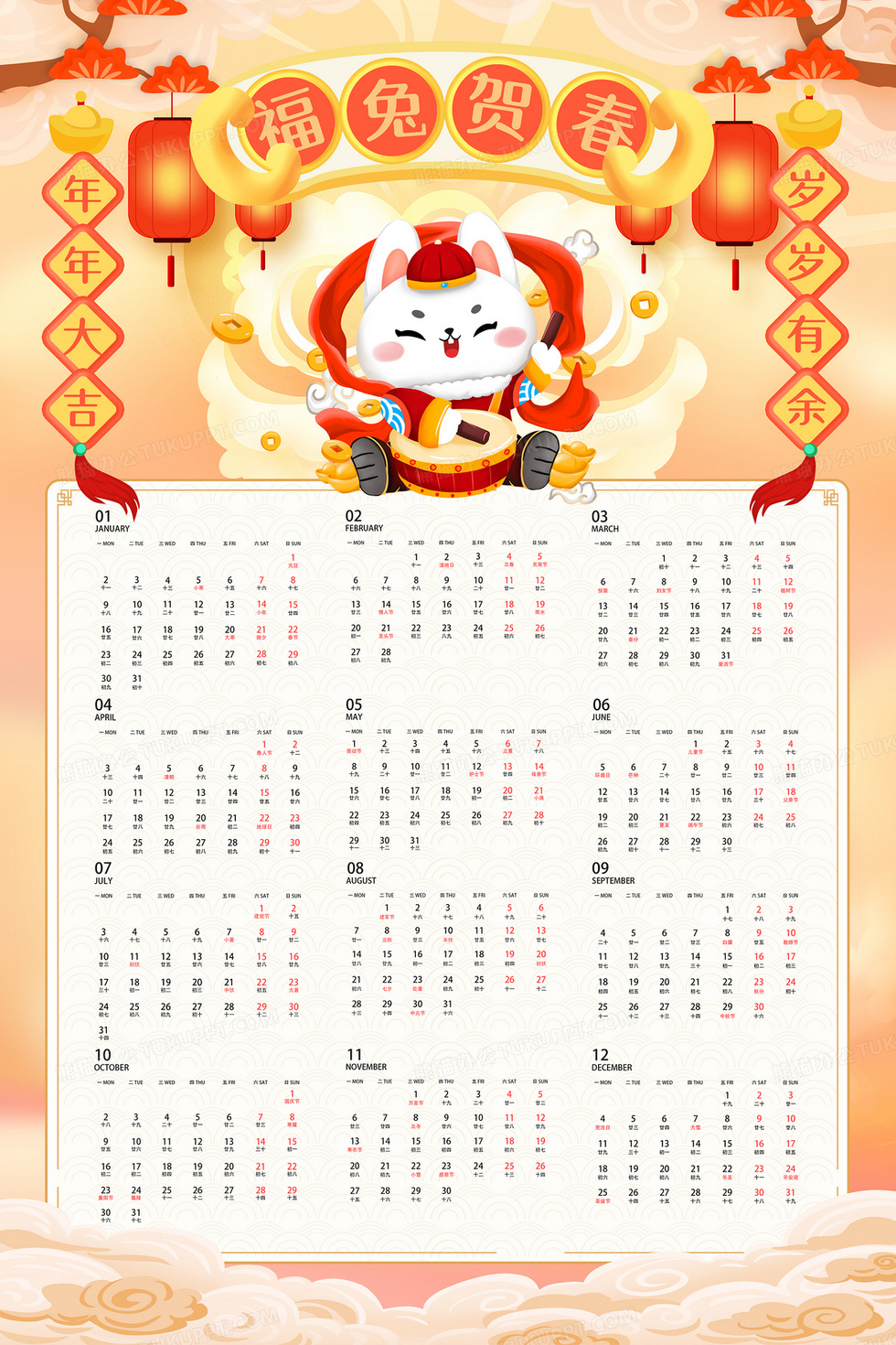本作品内容为2023兔年日历年历国潮风福兔贺岁背景, 格式为 psd, 大小72 MB, 图片尺寸为3543 x 5315, 作品中背景图片无需修改, 源文件无水印,可以直接使用, 欢迎使用熊猫办公。 如认为平台内容涉嫌侵权,可通过邮件:tousu@tukuppt.com提出书面通知,我们将及时处理。