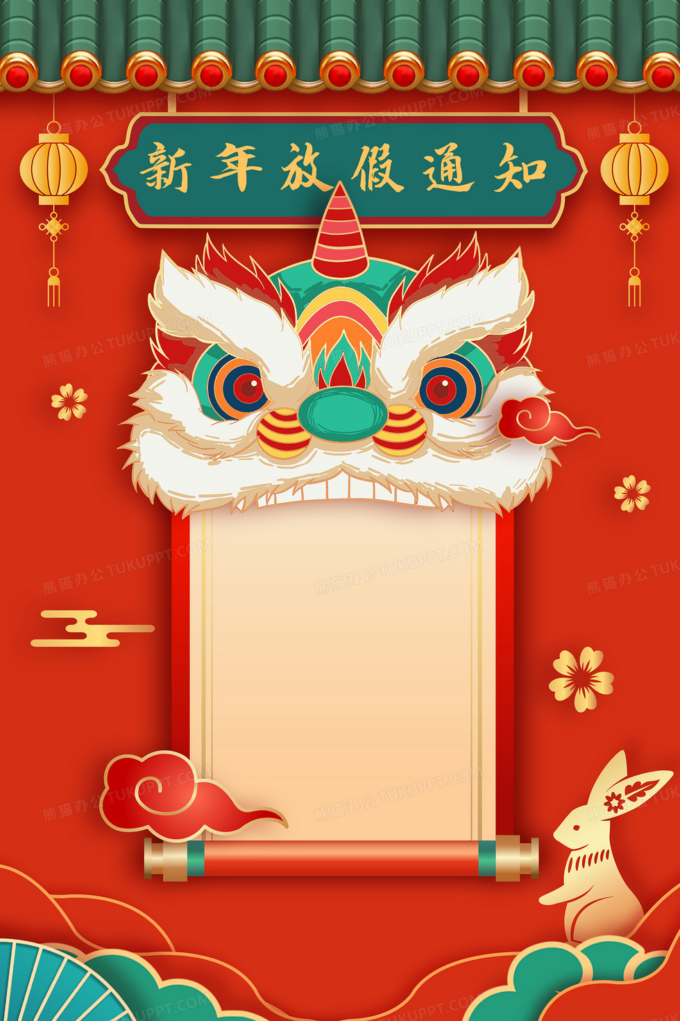 本作品内容为新年放假通知兔年舞狮中国风立体剪纸风背景, 格式为 psd, 大小19 MB, 图片尺寸为3543 x 5315, 作品中背景图片无需修改, 源文件无水印,可以直接使用, 欢迎使用熊猫办公。 如认为平台内容涉嫌侵权,可通过邮件:tousu@tukuppt.com提出书面通知,我们将及时处理。
