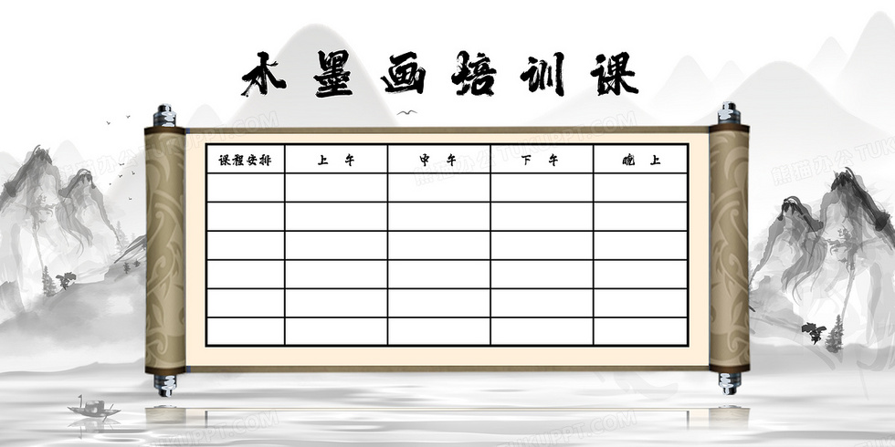 本作品内容为水墨画培训课程表背景, 格式为 psd, 大小22 MB, 图片尺寸为4724 x 2362, 作品中背景图片无需修改, 源文件无水印,可以直接使用, 欢迎使用熊猫办公。 如认为平台内容涉嫌侵权,可通过邮件:tousu@tukuppt.com提出书面通知,我们将及时处理。