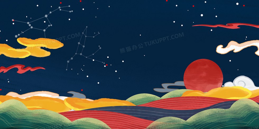 本作品内容为新中式神话风手绘重彩红日背景, 格式为 psd, 大小32 MB, 图片尺寸为4724 x 2362, 作品中背景图片无需修改, 源文件无水印,可以直接使用, 欢迎使用熊猫办公。 如认为平台内容涉嫌侵权,可通过邮件:tousu@tukuppt.com提出书面通知,我们将及时处理。