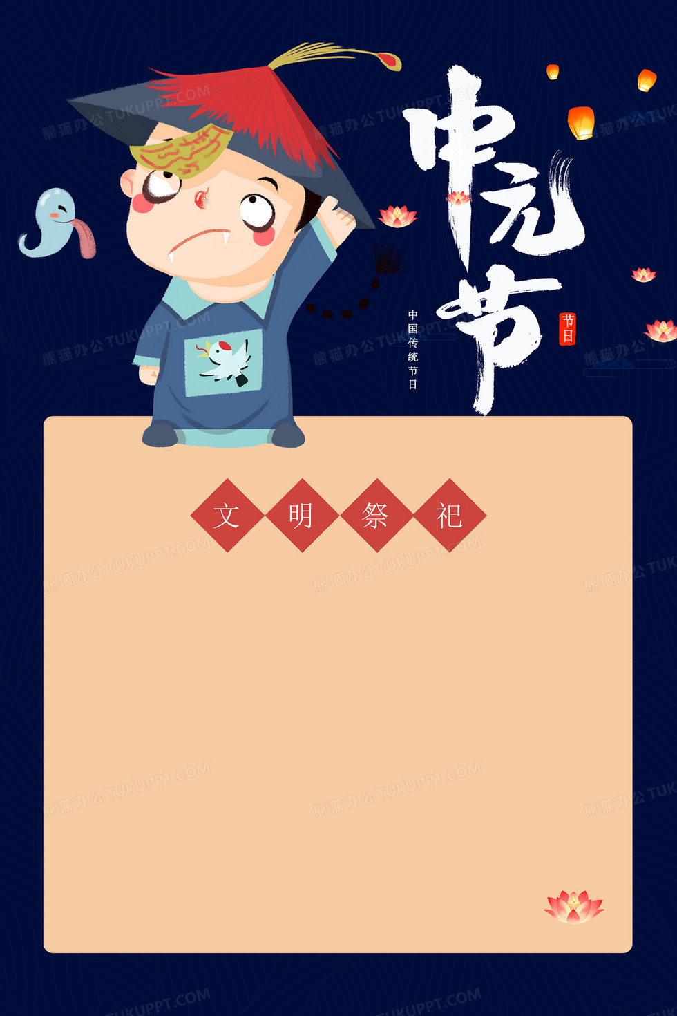 本作品内容为蓝色大气简约中元节放假通知背景, 格式为 psd, 大小14 MB, 图片尺寸为3543 x 5315, 作品中背景图片无需修改, 源文件无水印,可以直接使用, 欢迎使用熊猫办公。 如认为平台内容涉嫌侵权,可通过邮件:tousu@tukuppt.com提出书面通知,我们将及时处理。