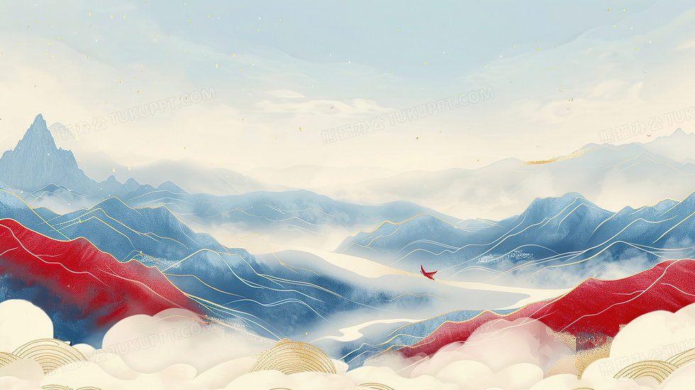 本作品内容为简约中国风国潮山水画鎏金背景图, 格式为 jpg, 大小3 MB, 图片尺寸为2912 x 1632, 作品中背景图片无需修改, 源文件无水印,可以直接使用, 欢迎使用熊猫办公。 如认为平台内容涉嫌侵权,可通过邮件:tousu@tukuppt.com提出书面通知,我们将及时处理。