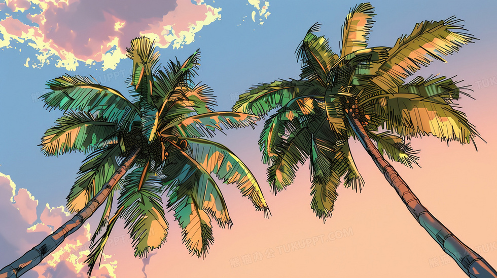 本作品内容为唯美夏季海滩椰子树风景插画, 格式为 jpg, 大小3 MB, 图片尺寸为2912 x 1632, 源文件无水印, 欢迎使用熊猫办公。 如认为平台内容涉嫌侵权,可通过邮件:tousu@tukuppt.com提出书面通知,我们将及时处理。