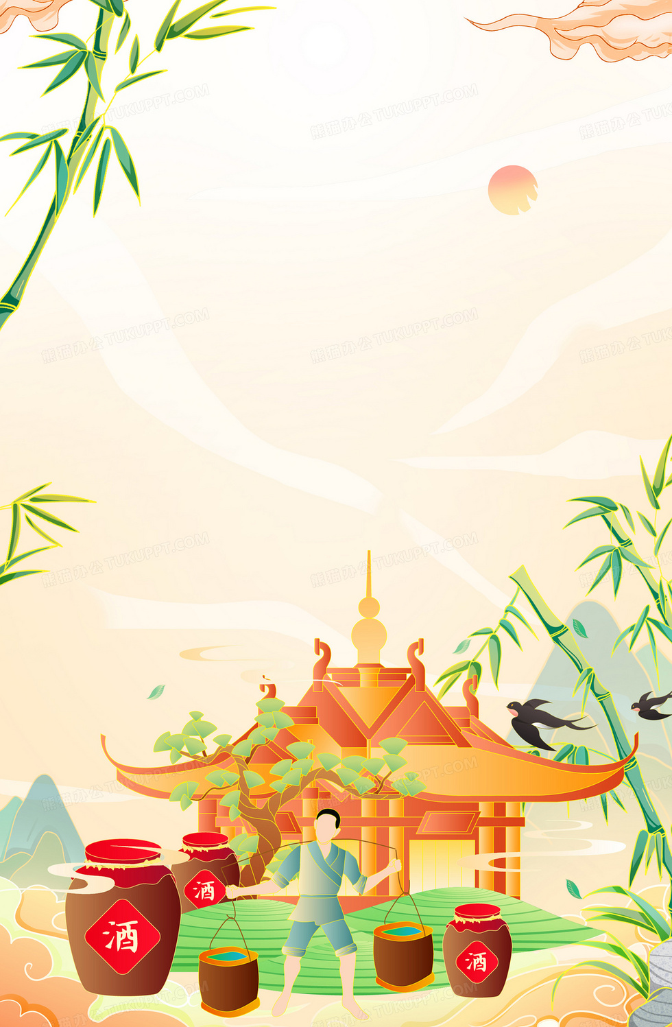 本作品内容为中国风竹叶白酒酒瓶背景, 格式为 psd, 大小62 MB, 图片尺寸为3543 x 5413, 作品中背景图片无需修改, 源文件无水印,可以直接使用, 欢迎使用熊猫办公。 如认为平台内容涉嫌侵权,可通过邮件:tousu@tukuppt.com提出书面通知,我们将及时处理。