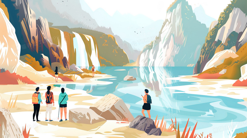 本作品内容为夏季山谷中徒步欣赏风景的人们插画, 格式为 jpg, 大小3 MB, 图片尺寸为2912 x 1632, 源文件无水印, 欢迎使用熊猫办公。 如认为平台内容涉嫌侵权,可通过邮件:tousu@tukuppt.com提出书面通知,我们将及时处理。
