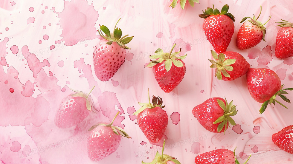 本作品内容为粉色水彩背景上散落的草莓插画, 格式为 jpg, 大小3 MB, 图片尺寸为2912 x 1632, 源文件无水印, 欢迎使用熊猫办公。 如认为平台内容涉嫌侵权,可通过邮件:tousu@tukuppt.com提出书面通知,我们将及时处理。
