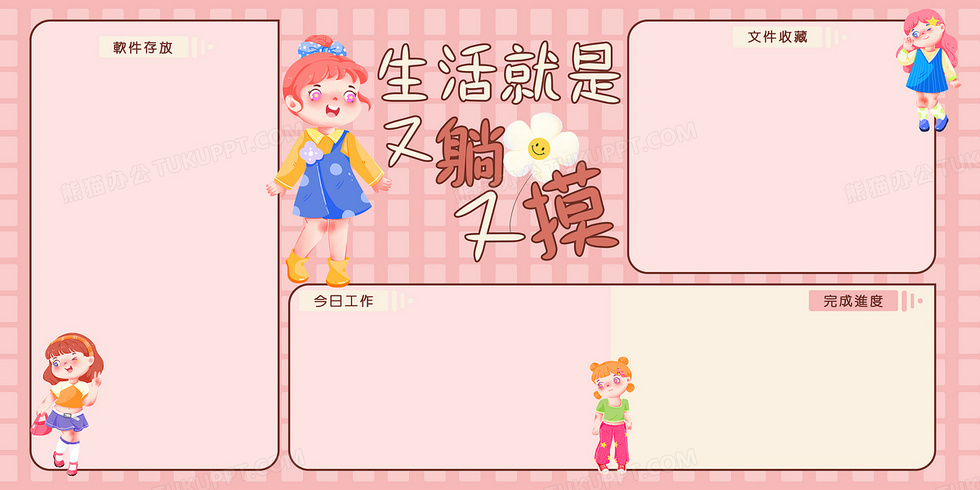 本作品内容为卡通可爱清新摸鱼电脑壁纸背景, 格式为 psd, 大小7 MB, 图片尺寸为4724 x 2362, 作品中背景图片无需修改, 源文件无水印,可以直接使用, 欢迎使用熊猫办公。 如认为平台内容涉嫌侵权,可通过邮件:tousu@tukuppt.com提出书面通知,我们将及时处理。