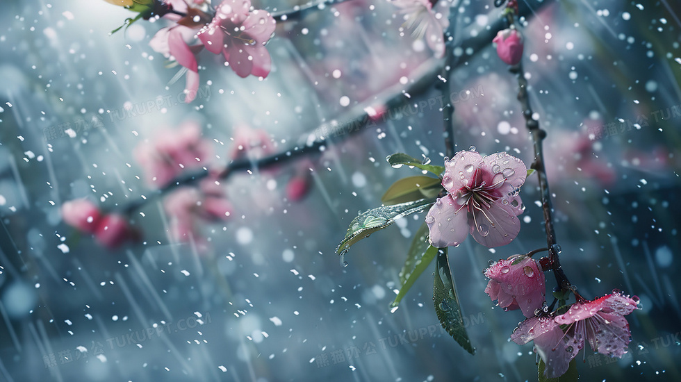 本作品内容为唯美春天下雨桃花插画, 格式为 jpg, 大小3 MB, 图片尺寸为2912 x 1632, 源文件无水印, 欢迎使用熊猫办公。 如认为平台内容涉嫌侵权,可通过邮件:tousu@tukuppt.com提出书面通知,我们将及时处理。