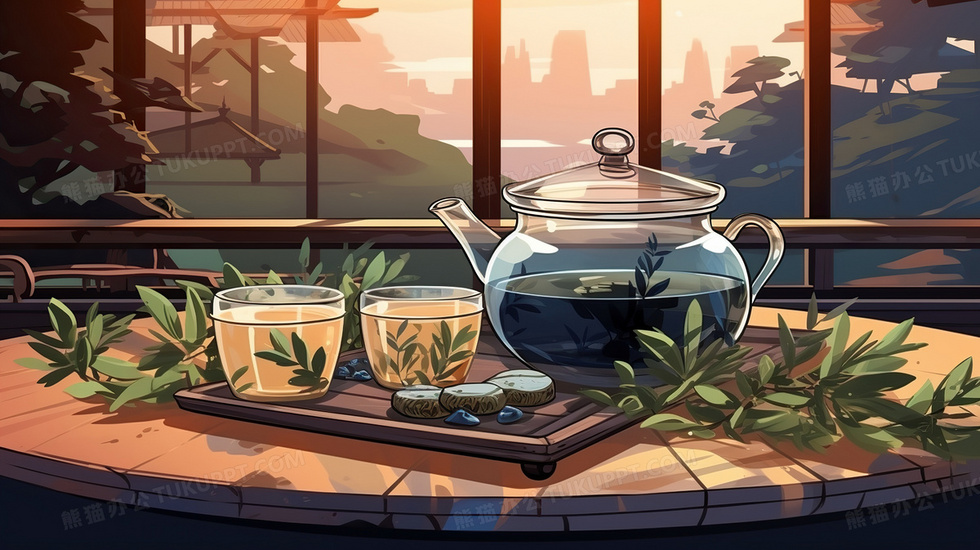 本作品内容为绿茶泡茶茶壶茶叶品茶插画, 格式为 jpg, 大小3 MB, 图片尺寸为2912 x 1632, 源文件无水印, 欢迎使用熊猫办公。 如认为平台内容涉嫌侵权,可通过邮件:tousu@tukuppt.com提出书面通知,我们将及时处理。