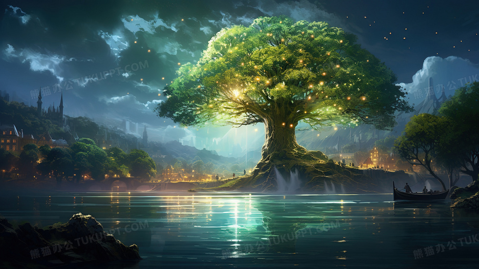 本作品内容为河岸边一棵闪闪发光的魔法树插画, 格式为 jpg, 大小3 MB, 图片尺寸为2912 x 1632, 源文件无水印, 欢迎使用熊猫办公。 如认为平台内容涉嫌侵权,可通过邮件:tousu@tukuppt.com提出书面通知,我们将及时处理。