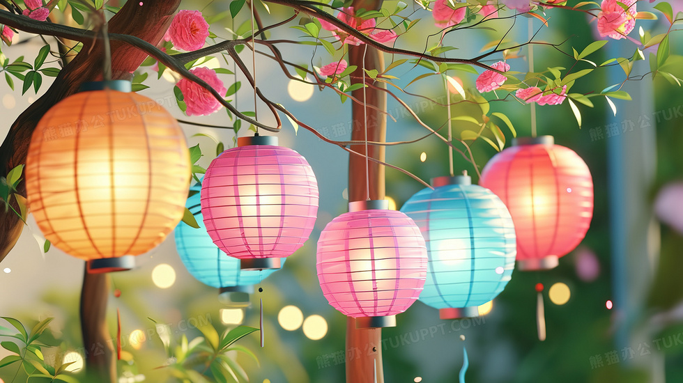 本作品内容为庭院中挂着的七彩灯笼插画, 格式为 jpg, 大小3 MB, 图片尺寸为2912 x 1632, 源文件无水印, 欢迎使用熊猫办公。 如认为平台内容涉嫌侵权,可通过邮件:tousu@tukuppt.com提出书面通知,我们将及时处理。