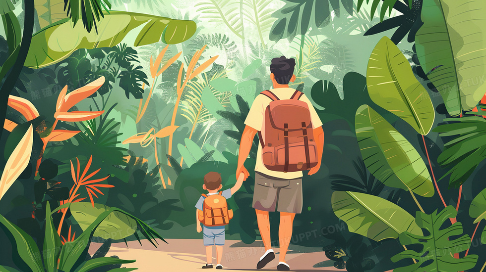 本作品内容为父亲带着孩子背着双肩包在森林探险插画, 格式为 jpg, 大小3 MB, 图片尺寸为2912 x 1632, 源文件无水印, 欢迎使用熊猫办公。 如认为平台内容涉嫌侵权,可通过邮件:tousu@tukuppt.com提出书面通知,我们将及时处理。