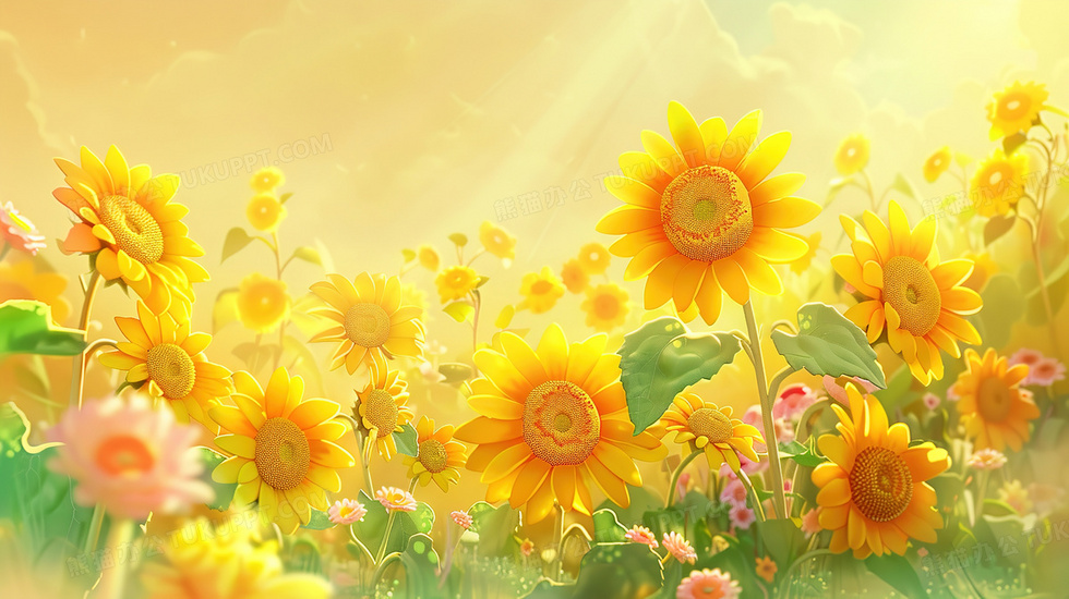 本作品内容为唯美黄色向日葵花海插画, 格式为 jpg, 大小3 MB, 图片尺寸为2912 x 1632, 源文件无水印, 欢迎使用熊猫办公。 如认为平台内容涉嫌侵权,可通过邮件:tousu@tukuppt.com提出书面通知,我们将及时处理。