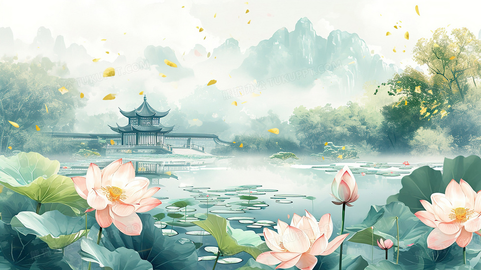 本作品内容为唯美中国风荷花湖心亭插画, 格式为 jpg, 大小3 MB, 图片尺寸为2912 x 1632, 源文件无水印, 欢迎使用熊猫办公。 如认为平台内容涉嫌侵权,可通过邮件:tousu@tukuppt.com提出书面通知,我们将及时处理。