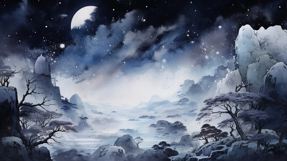 本作品内容为唯美水墨国风星空山水景色插画, 格式为 jpg, 大小4 MB, 图片尺寸为2912 x 1632, 源文件无水印, 欢迎使用熊猫办公。 如认为平台内容涉嫌侵权,可通过邮件:tousu@tukuppt.com提出书面通知,我们将及时处理。