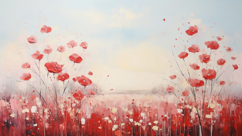 本作品内容为盛开的红色鲜花花海油画插画, 格式为 jpg, 大小3 MB, 图片尺寸为2912 x 1632, 源文件无水印, 欢迎使用熊猫办公。 如认为平台内容涉嫌侵权,可通过邮件:tousu@tukuppt.com提出书面通知,我们将及时处理。
