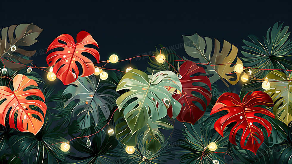 本作品内容为热带森林植物上挂着小灯饰插画, 格式为 jpg, 大小3 MB, 图片尺寸为2912 x 1632, 源文件无水印, 欢迎使用熊猫办公。 如认为平台内容涉嫌侵权,可通过邮件:tousu@tukuppt.com提出书面通知,我们将及时处理。