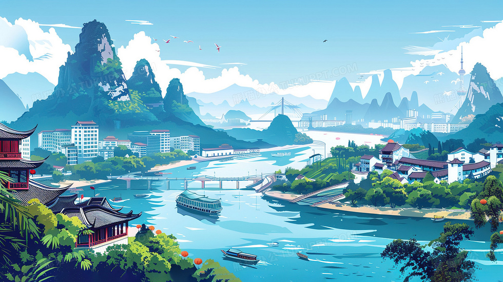 本作品内容为山谷河流旁的古建筑群插画, 格式为 jpg, 大小4 MB, 图片尺寸为2912 x 1632, 源文件无水印, 欢迎使用熊猫办公。 如认为平台内容涉嫌侵权,可通过邮件:tousu@tukuppt.com提出书面通知,我们将及时处理。
