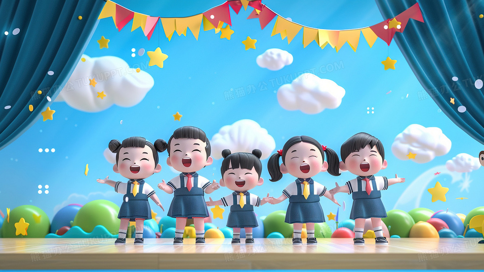 本作品内容为儿童幼儿园舞台表演的小朋友插画, 格式为 jpg, 大小3 MB, 图片尺寸为2912 x 1632, 源文件无水印, 欢迎使用熊猫办公。 如认为平台内容涉嫌侵权,可通过邮件:tousu@tukuppt.com提出书面通知,我们将及时处理。