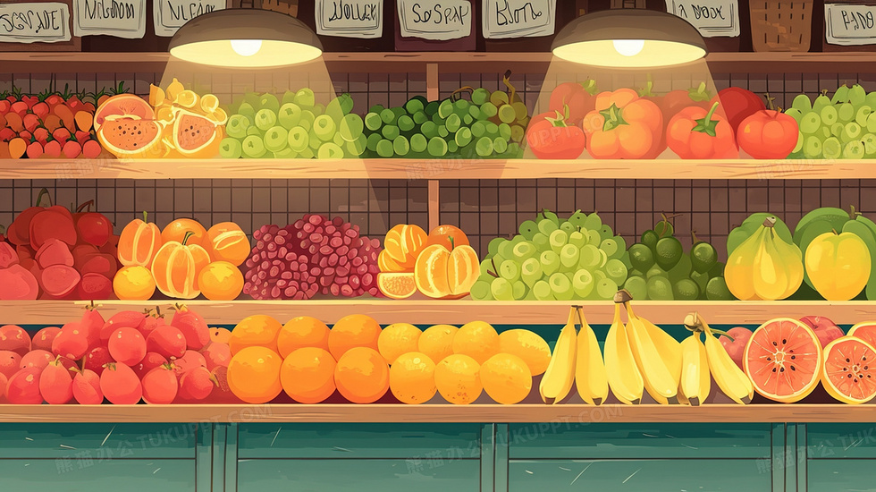 本作品内容为水果店里的琳琅满目的水果插画, 格式为 jpg, 大小3 MB, 图片尺寸为2912 x 1632, 源文件无水印, 欢迎使用熊猫办公。 如认为平台内容涉嫌侵权,可通过邮件:tousu@tukuppt.com提出书面通知,我们将及时处理。