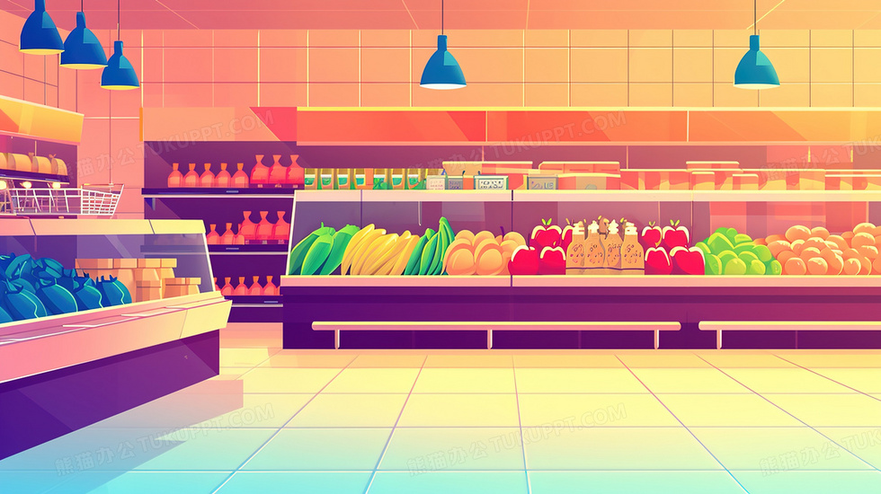 本作品内容为商场里蔬菜水果陈列场景插画, 格式为 jpg, 大小2 MB, 图片尺寸为2912 x 1632, 源文件无水印, 欢迎使用熊猫办公。 如认为平台内容涉嫌侵权,可通过邮件:tousu@tukuppt.com提出书面通知,我们将及时处理。