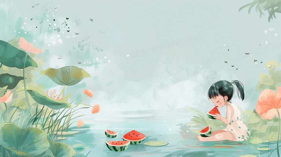本作品内容为夏天女孩子在池塘边吃西瓜插画, 格式为 jpg, 大小3 MB, 图片尺寸为2912 x 1632, 源文件无水印, 欢迎使用熊猫办公。 如认为平台内容涉嫌侵权,可通过邮件:tousu@tukuppt.com提出书面通知,我们将及时处理。