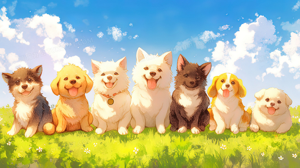 本作品内容为蓝天白云草地上的宠物小狗插画, 格式为 jpg, 大小3 MB, 图片尺寸为2912 x 1632, 源文件无水印, 欢迎使用熊猫办公。 如认为平台内容涉嫌侵权,可通过邮件:tousu@tukuppt.com提出书面通知,我们将及时处理。