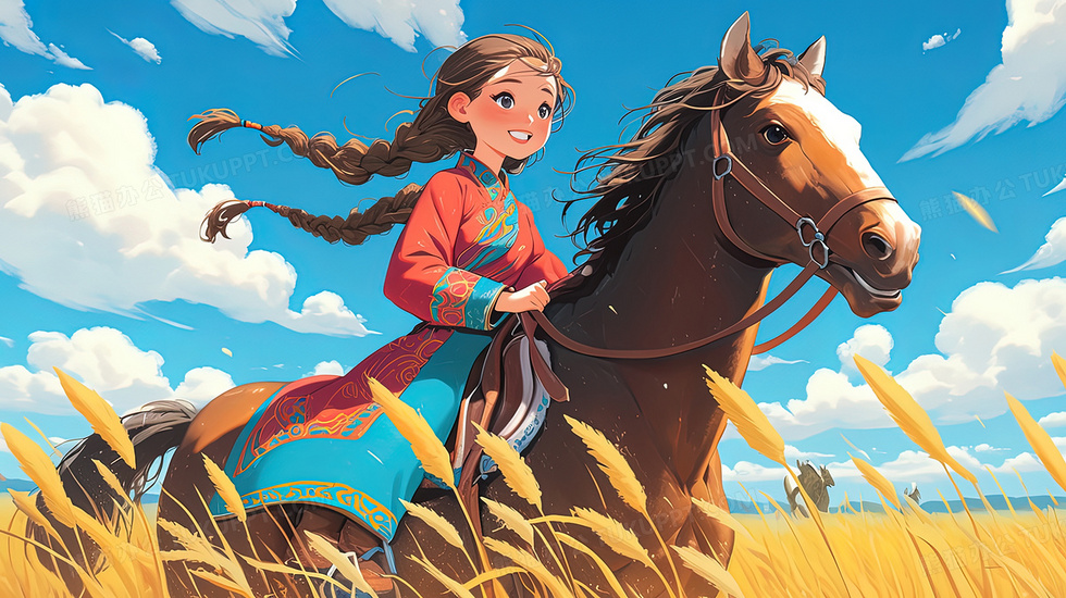 首页 > 插画 > 科技艺术 > 卡通漫画 > 蓝天白云草原骑马的蒙古少女插画