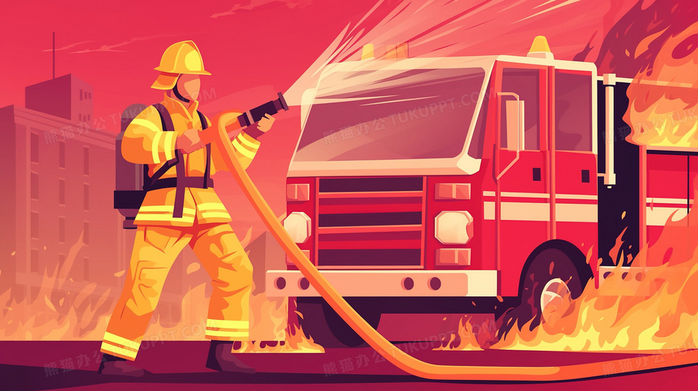 本作品内容为消防员拿着水管灭火演习宣传插画, 格式为 jpg, 大小2 MB, 图片尺寸为2912 x 1632, 源文件无水印, 欢迎使用熊猫办公。 如认为平台内容涉嫌侵权,可通过邮件:tousu@tukuppt.com提出书面通知,我们将及时处理。