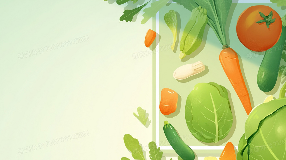 本作品内容为绿色新鲜蔬菜装饰边框背景, 格式为 jpg, 大小2 MB, 图片尺寸为2912 x 1632, 作品中背景图片无需修改, 源文件无水印,可以直接使用, 欢迎使用熊猫办公。 如认为平台内容涉嫌侵权,可通过邮件:tousu@tukuppt.com提出书面通知,我们将及时处理。