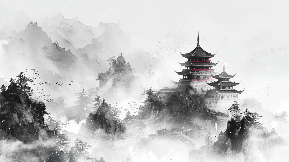 本作品内容为水墨风中国式建筑背景, 格式为 jpg, 大小3 MB, 图片尺寸为2912 x 1632, 作品中背景图片无需修改, 源文件无水印,可以直接使用, 欢迎使用熊猫办公。 如认为平台内容涉嫌侵权,可通过邮件:tousu@tukuppt.com提出书面通知,我们将及时处理。