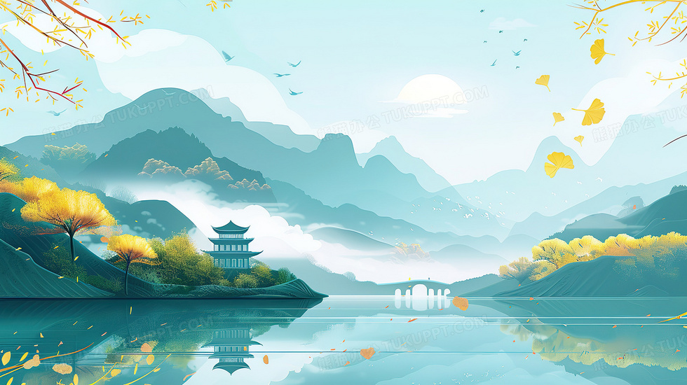 本作品内容为中国风山水银杏树建筑插画, 格式为 jpg, 大小6 MB, 图片尺寸为2912 x 1632, 源文件无水印, 欢迎使用熊猫办公。 如认为平台内容涉嫌侵权,可通过邮件:tousu@tukuppt.com提出书面通知,我们将及时处理。