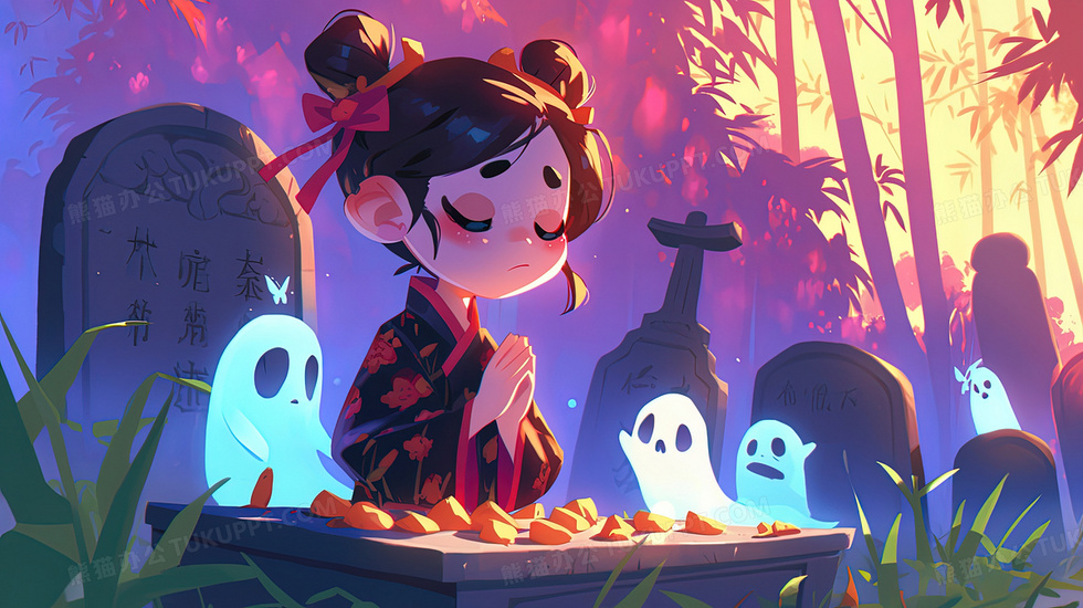首页 > 插画 > 科技艺术 > 卡通漫画 > 中元节小女孩祭奠亲人扫墓周围小精灵