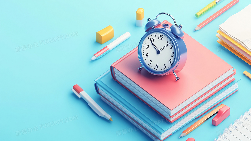 本作品内容为书本闹钟教育立体文具简约背景, 格式为 jpg, 大小3 MB, 图片尺寸为2912 x 1632, 作品中背景图片无需修改, 源文件无水印,可以直接使用, 欢迎使用熊猫办公。 如认为平台内容涉嫌侵权,可通过邮件:tousu@tukuppt.com提出书面通知,我们将及时处理。